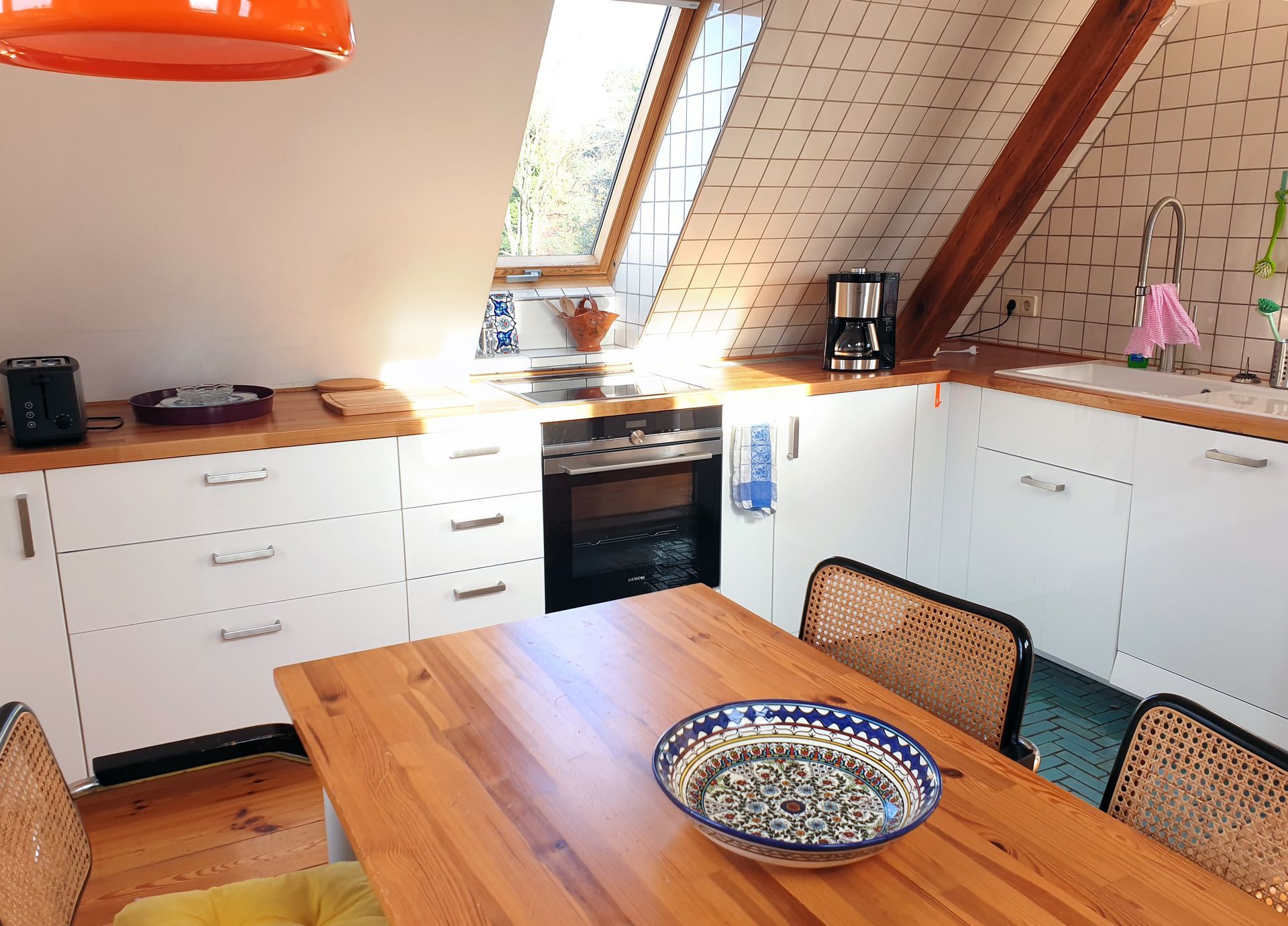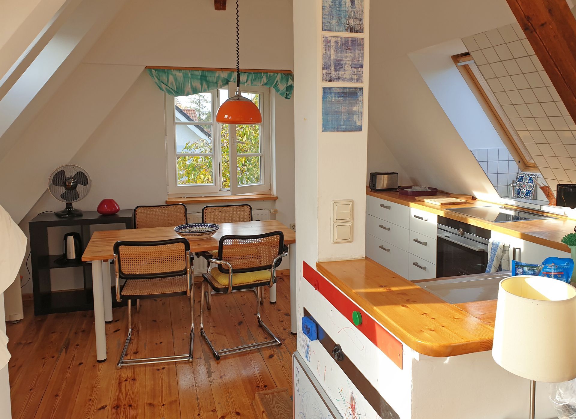 Die helle Dachgeschosswohnung liegt in Kleinmachnow zwischen Berlin und Potsdam. Machen Sie von hier aus Ausflüge mit dem Auto in die beiden Hauptstädte oder genießen Sie eine Auszeit auf der Dachterrasse.
